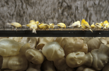 Ann Hamilton. "Accountings," Jan. 22 - April 5, 1992 (installation view, Henry Art Gallery). Steel tokens, soot, steel, glass, cast wax heads, canaries. Photo: Richard Nicol.