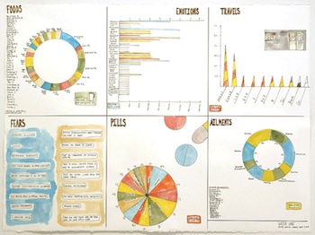Mazzalupo’s obsessively detailed lists and charts sometimes read like the tables of scientific journals. Countdown: Week 1 presents six distinct boxes titled “Foods,” “Emotions,” “Travels,” “Fears,” “Pills,” and “Ailments.” A number is written next to each item in a long register of mostly gluten-free foods. Diet Coke, salad, beef, brussels sprouts, and chocolate receive scores of one. The number two follows stuff like tofu, soy yogurt, and eggs on toast. Protein shakes, muffins, and tacos scale slightly higher. These foods and figures are then calculated into percentages and plotted on a multicolored donut chart. Decaf with soy made up the largest part of Mazzalupo’s diet that week at 15 percent. From a similar graphic, I learn that the artist is plagued by stomachaches, backaches, headaches, exhaustion, allergies, hives, dizziness, and swelling. Her list of her fears, written in black ink and bordered by clouds of brown and blue paint, ranges from loneliness and loss to repeated rejection from the MacDowell Colony and a bad art show. In another section, slabs of color stretch across a horizontal bar graph to reveal high levels of guilt, relief, and happiness, while feelings of love and anxiety are nil. This leads me to wonder about Mazzalupo’s medications; in a lovely pie chart of sky blue, mustard, and moss colors, Zoloft emerges as the dominant drug with a “high score” of 12 percent.