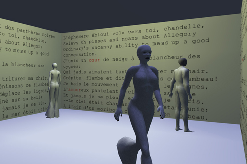 Often, machinima serves as documentation of art created online. This happens in virtual 3D space that is distinctly different than becoming immersed, as a 3D avatar that freely moves within a world that transcends physical constraints and traditional concepts of time and space. Mixed Reality exhibitions often explore a variety of forms, including two-, three-, and four-dimensional aspects of art. Visitors are encouraged to bring both their material and virtual selves to the work.