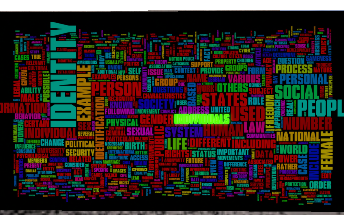 AD: Well, the 0s and 1s refer to the way our identity is kept on registers. Also for the tag cloud image above us, I added more than 300 texts referring to identity. Then I made statistics about the most important words and this is the result. I expected to make my own choice of text quite nihilistic with the large number I collected.