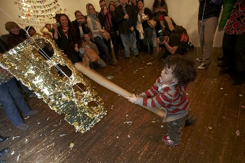 The much-talked-about Andy Warhol piñata, created by Jennifer Rubell for last month’s Brooklyn Ball, offered a witty art spin on an old party tradition. Instead of the usual candy contents, this piñata spilled Hostess brand snack cakes, icons of American junk food culture, redolent of Warhol’s work in pop art. Given the amount of art world enthusiasm about the piece, it seems a good moment to look at piñatas as an art form. Rubell is not the first to make clever use of this sweet-filled object. What follows is by no means an exhaustive history of artist’s piñatas, but a look at some recent ones that, similar to Rubell’s, were stuffed with small treats and big concepts.