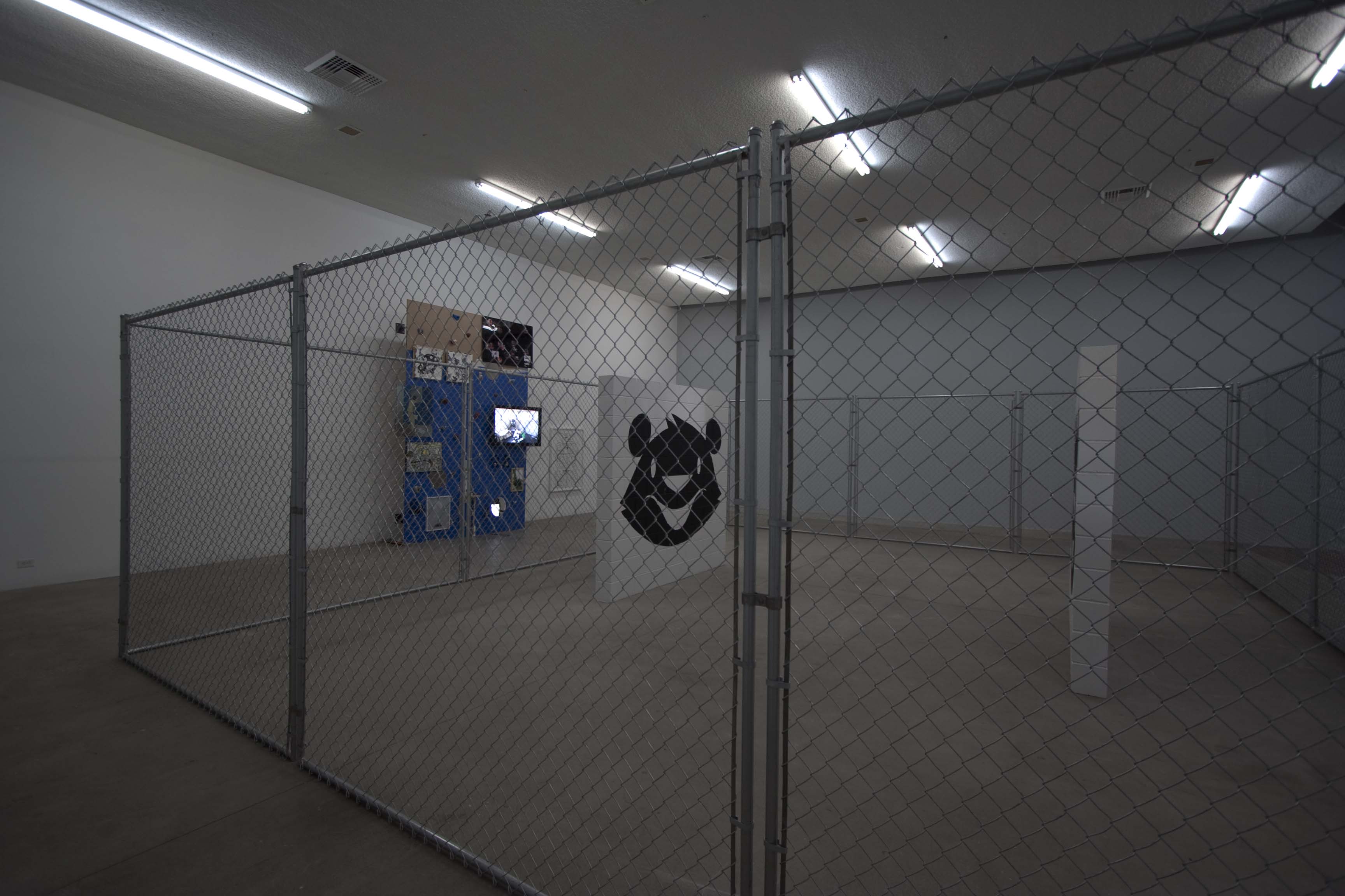 A chain-link fence installed by Andrews closes off most of the gallery central floor space. Two white brick walls with caricatures of grinning cartoon bears painted on them stand in the middle of the fenced-off area. The caricatures face each other and seem completely self-contained. They have all the support they need, which means that, for viewers, circumventing the fence and heading to the back wall to see Mateo Tannatt’s Monster Model: Blue Screen Version makes the most sense.