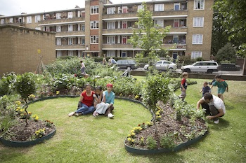 Fritz Haeg, "Edible Estates Regional Prototype Garden #4" (installation view), 2007. Commissioned by Tate Modern, London. Courtesy the artist and The Aldrich Contemporary Art Museum. Photo: Jane Sabire.