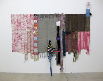 Josh Faught “Triage,” 2009. Hemp, nail polish, spray paint, indigo, logwood, toilet paper, greeting cards, pins, books, plaster, yarn, hand made wooden sign, denim, and gloves. Courtesy Lisa Cooley Fine Art
