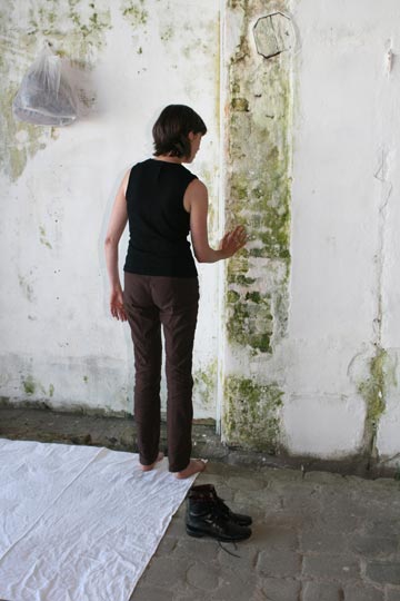 In the Deformes International Performance Bienal at the Museo de arte contemporaneo in Valdivia, Chile, the Montreal-based artist performed Uprooting (2008). Working instinctively in her allocated space, she chanced upon moss growing on the wall and the weeds growing in the cracks of the floor, and used them as points of departure. She murmured espejo, espero (mirror, I wait/hope) to the wall, uprooted the weeds and laid them out. Her actions became interlaced with invocations to her parents and grandparents. In this performance, a delicateness, a deference for her environment infused Simon’s work with a sacred inspired quality. The audience witnessed a process unfold, meditative, considered, and subtle.