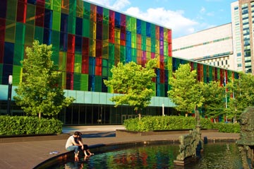 The fountain in Montreal's Place des Festivals in the Quartier des Spectacles is the largest programmable fountain in Canada (and currently features a nightly multimedia show by Moment Factory). This area functions as a fountain when it is not host to one of Montreal's multiple summer festivals. The city is currently revitalizing and creating the Quartier des Spectacles, an area of town with a high concentration of artistic venues around Place des Arts. Photo courtesy of Nancy Falso.