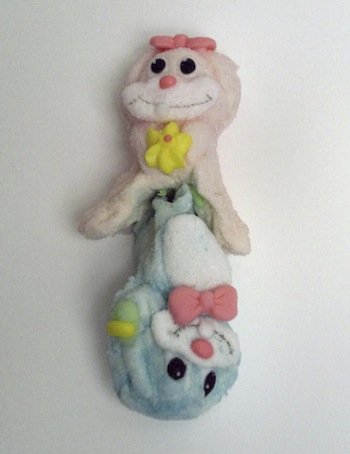Smith is one of many Art21 artists you will find in Licked Sucked Stacked Stuck. Jeff Koons’s Blue Diamond appears as a Ring Pop of course and, adding another layer of childhood nostalgia to the exhibition, Mike Kelley’s stuffed-animals are represented by Marshmallow Pals. “We made sure to use the down-market marshmallow candies you can find at Duane Reade around Easter. It was important to match the somewhat sad aspect of those Marshmallow Pals with Kelley’s choice of used and abused specimens of homemade or down-market toys,” said Root. (She was working on a dissertation of Kelley’s writings around this time.) She adds, “They were also very fun to squish together.” Delicate and temperamental, candy presented the artists with some unforeseen challenges. But Shore, who works with beeswax and found objects in his own practice, quickly mastered the material. “At a certain point, it becomes just another medium,” he said. “You develop techniques and learn how to handle it.”