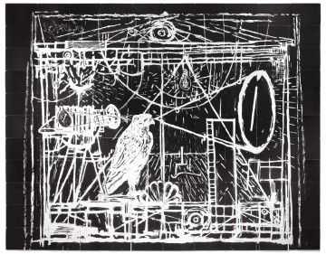 Layering serves a more philosophical purpose in Kentridge’s Learning the Flute diptych (illustrated at top), which he created in connection with his 2005 production of Mozart’s opera The Magic Flute. Kentridge was fascinated by the archetypal dichotomy in the story between Sarastro, the high priest of light (representing knowledge and truth), and the Queen of the Night (representing magic and superstition) – creating positive and negative mirror images that complement one another. The opera has long been understood as an allegory of Enlightenment principles; Kentridge here has included several references to knowledge, ideas, and truth, including the light bulb and the all-seeing eye. The scale, stage setting, temple imagery, and Kentridge’s familiar camera reference both the theatrical nature of the opera and the Allegory of the Cave, Plato’s classical parable on the nature of truth and knowledge.
