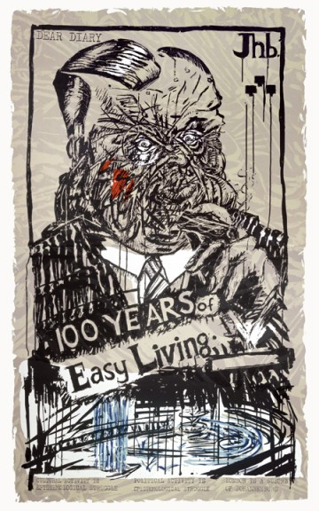 Kentridge’s interest in the political aspects of twentieth-century political art, particularly post-revolutionary Russian Constructivism and Weimar-period German Expressionism, have been examined in depth by curator Carolyn Christov-Bakargiev in her 1998 exhibition and catalogue William Kentridge, where she delves into the artist’s “paradoxical approach to modernism, implying a nostalgia for these utopias while suggesting that they are gone for good, that they have failed.”11 The screenprint triptych Art in a State of Siege (1988) is often held as the embodiment of Kentridge’s contradictory relationship to these art movements by the artist himself as well as scholars. On the other hand, General (1993/98) is a potent and straightforward statement on the type of gross corruption that frequently accompanies military power. As discussed by MoMA curator Judith Hecker, it demonstrates Kentridge’s debt to Weimar-period German artists Otto Dix and Max Beckmann; George Grosz’s smug and gluttonous officials also come to mind.