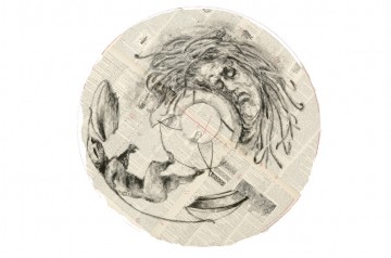 William Kentridge, "Medusa," 2001. Lithograph on chine collé of pages from Nouveau Larousse Illustré (ca. 1900) to white Rives BFK paper with mirror-finish steel cylinder, edition of 60. Image: 23 inches (58.5 cm) (diameter). Published by Parkett Publications, Zurich, Switzerland. Courtesy David Krut Projects, New York.