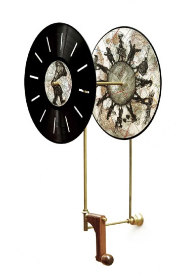 William Kentridge, "Phenakistoscope," 2000. Four-color lithograph on pages from "Bacon’s Popular Atlas of the World" (1951) attached to two gramophone records, machined metal shafts, gear mechanisms, and wooden handle, edition of 40. Image: 11 ½ in. (29.2 cm) (diameter); overall: 31 ½ x 11 ½ x 11 ½ in. (80 x 29.2 x 29.2 cm). Published by New Museum of Contemporary Art, New York. Courtesy David Krut Projects, New York.