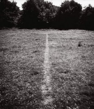It is no wonder that walking has greatly impacted a number of British artists, such as Hamish Fulton and Richard Long. In 1967, Long, a twenty-two year old student at Saint Martin’s School of Art in London, walked back and forth along a straight line in English countryside. His path left linear track, which was documented in a black and white photo. This single image is now seen as a milestone in land/walking-based art.
