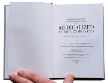 Jesse Aron Green, "Ärztliche Zimmergymnastik," 2010. Artist's book. Hand-bound, hard-bound, with 56 french-folded pages. Featuring a reproduction of the complete series of 45 photographs titled "Illustration and Description of the Medico-Gymnastic Exercises," and 122 computer-assisted drawings. Courtesy the artist.