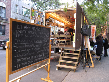 We moved William Pope.L’s Black Factory to Union Square rather than have it here on campus. On the occasion of The New School’s 90th anniversary, we organized an exhibition and many events called “By Any Name: Institutional Memory at The New School,” all hosted in the relatively remote and safe environment of a van, parked outside the university’s main building. This discussion was thus liberated from institutional constraints, yet connected to them. Sometimes irreverence sneaks in, for instance, during a summit of dignitaries from real and imagined countries presented on occasion of Bush’s creation of a Department of Homeland Security (in collaboration with Cabinet magazine). Or when we engage fortunetellers to introduce other forms of scholarship.