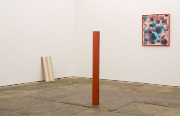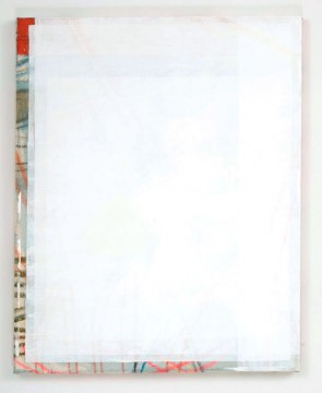 Striped bathroom wallpaper, Cy Twombly, Imi Knoebel, and scribbles resembling Pop-like lineaments or cave markings are all evoked by Matt Connors work in his current exhibition at Canada Gallery. Red and green pillars of solid color, made from digital C-prints, stand like abstract Photoshop totems to Color Field painting. Neon splashes cover one canvas while another contains three beige, geometric rectangles. Colors, although never clashing on a single canvas, vary dramatically from brash to soft pastels throughout, as do the abstract influences that Connors depicts. One canvas resembles the frame of a painting, and the next echoes a chaotic, colorful Matisse collage. Tropical contains juxtapositions within the work itself: a brightly colored image has been overpainted by a layer of white that almost covers the surface but the edges have been left exposed so the vibrancy peeks out from behind. Another work, Tunnel, conjures a three-dimensional image through the title but consists of two colorful rectangles (one within the other) framing a brown Kenneth Noland-like bullseye that instead appears flat against the canvas. Connors refuses to stick with just one abstract model and repeatedly plays with overlooked gestures such as the doodle-like markings. It is as though he has selected sections of various Modernist works, examined them closely and then made them his own.