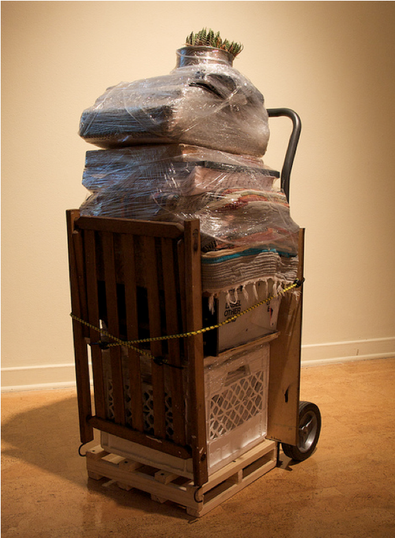 BA: The Silver Galleon Press method of bookmaking is an economical and efficient process that can be learned by all. First, the captured PDF is minimally processed using the budget page-imposition software Cheap Imposter (OS X) to rearrange pages for printing. The PDF is then printed using generic printer ink, found online for as cheap as $1.99 a cartridge ($.01/page B+W). The pages are cut, folded and bound using common office supplies such as heavy-duty staples, two-hole brackets, and a wide variety of glue and tape (as in hot and duct, respectively). Covers are made from salvaged materials of all kinds (file folders, cardboard boxes, canvas, photo-backdrop paper, fabric, mass produced books, etc) manipulated with collage, paint and other mixed media. The whole operation can be reproduced anywhere and will adapt to exploit specific resources at any given venue/institution (ie color copiers, interns, etc…) Finished titles are distributed freely, by barter or on a pay-what-you-wish basis (and often part of a larger sculptural installation.)