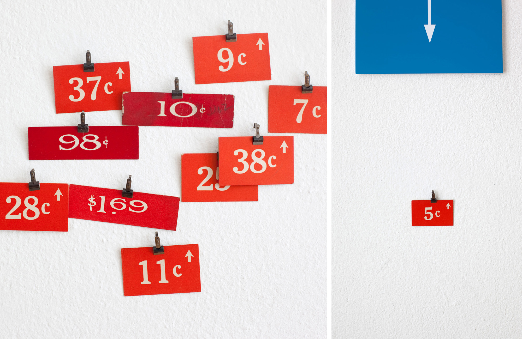 Materials aren’t neutral — they carry meaning along with their histories of production and use. Perhaps this preoccupation with materials is a pre-digital sensibility? I’m interested in the inflection of meaning that occurs through the materials’ specificity. In Berlin this past summer, I exhibited Constellations, an installation which employed 5 and 10 cent store price tags from the 40s. At the gallery the price tags were arranged in loose clusters along with arrow signs indicating direction or possible locations. The work referenced economies – – an economy of scale, of transport (the work could be packed in a small suitcase and brought to Europe in an overhead rack) but most importantly, the work spoke to this moment of global economic crisis and the oblique and often indecipherable relationships between interwoven economic forces that shape our options on the most elemental level… the price of bread. With their archaic prices: 7 cents, 11 cents, 29 cents, 12 for $1.79, the bright red tags with their worn surfaces and minute sums arranged in seeming infinite clusters spoke to me of the indecipherability of the global economic crisis.