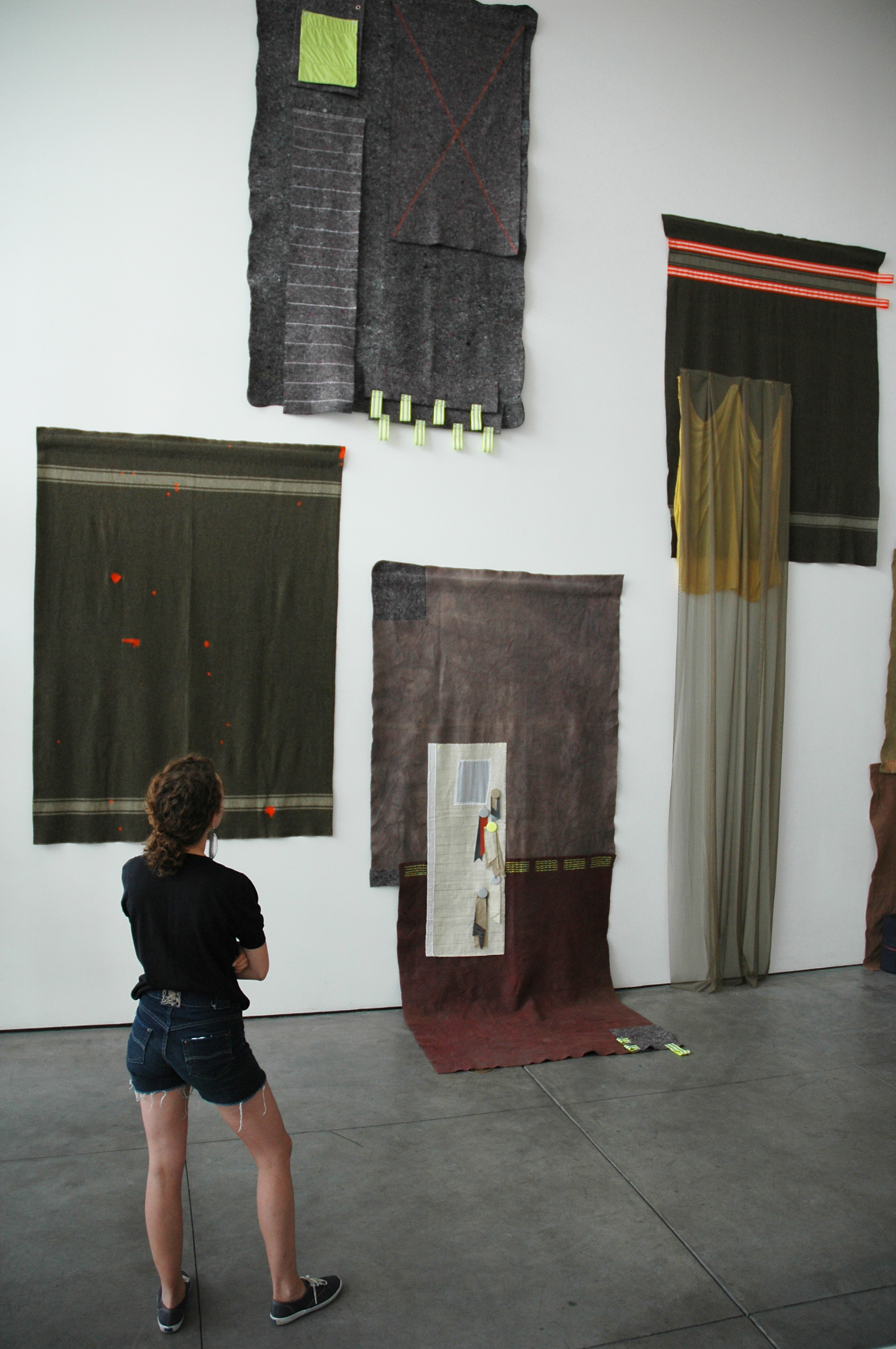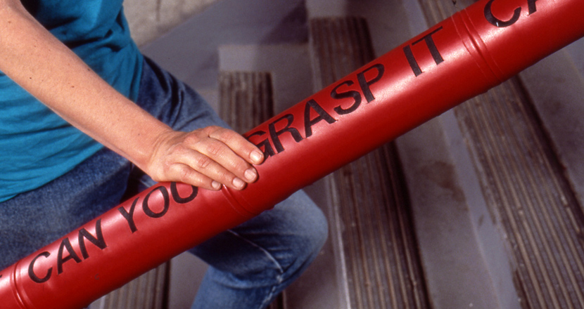 One of the strategies I’ve consistently employed is to locate my work outside this zone of expectations. One instance is the Marginal Way, which was included in an exhibition of installations in the Cyclorama in Boston. There were two two-story structures designed as viewing apparatuses built by Kennedy Violich Architects to house the installations. I choose to locate my work, a series of sculptural interventions, in and around these structures. The Marginal Way began at the staircase as you entered the building. I installed a soft banister cover with the embroidered text asking, “can you grasp it?” Working closely with the architects, I installed other elements of the installation in and around the architectural structures, on a balcony, in vitrines, down corridors, in a directory case. So the Marginal Way became a series of markers, a kind of navigational commentary on movement both physical and political.