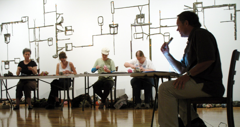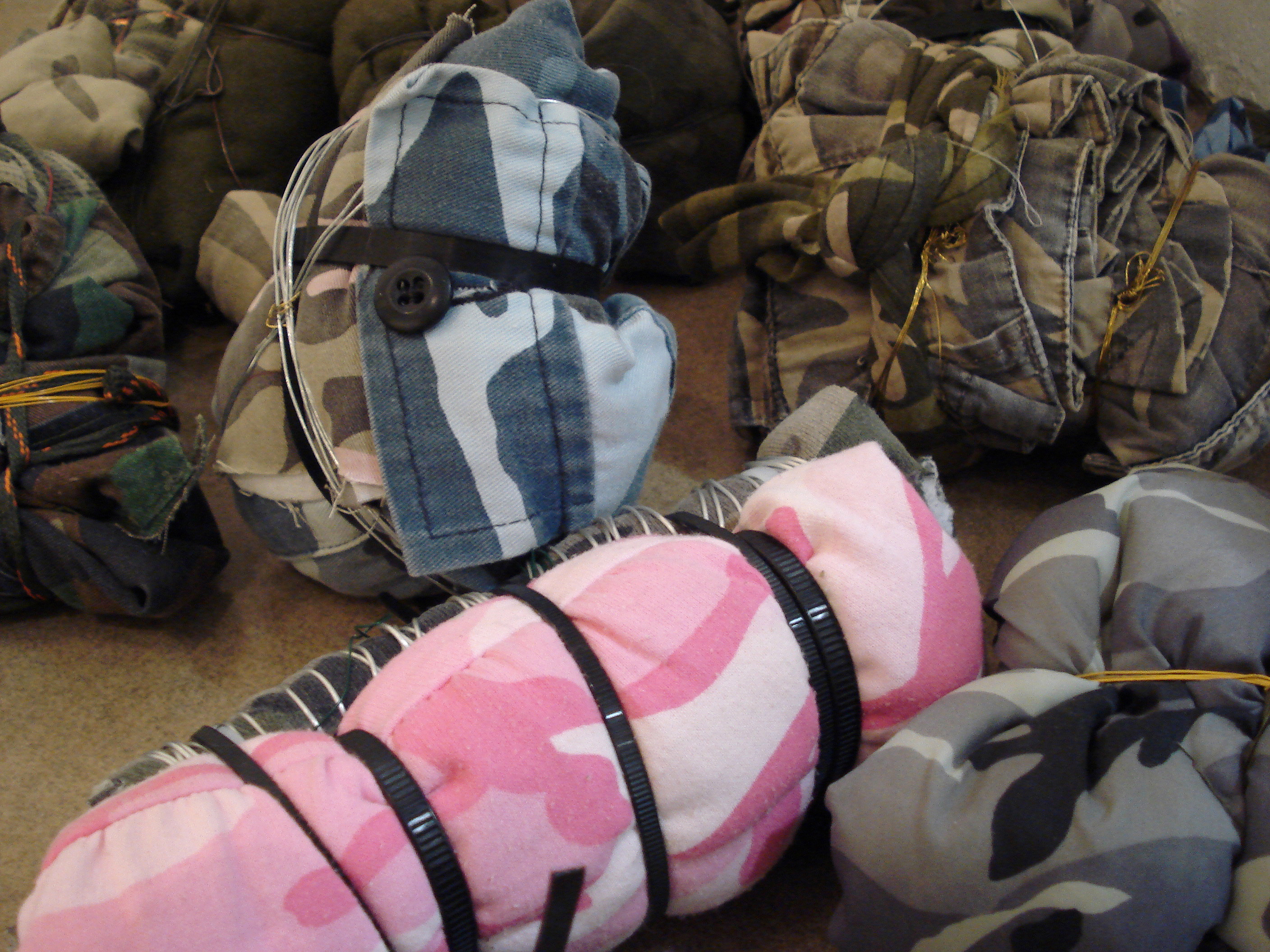 For subsequent group exhibitions — Consuming War in 2008 at The Hyde Park Art Center in Chicago and Experimental Geography in 2009 at The Albuquerque Museum of Art in New Mexico — I organized events involving local writers in both communities to read original works. Both were performance/readings modeled on the tradition of “El Lector,” a reader, collectively paid by fellow workers at cigar factories in Cuba from the late nineteenth century into the twentieth century to read aloud literature, political texts, and the news throughout the workday, while workers listened and rolled cigars. In this case, a team of volunteers made bundles out of re-purposed camouflage clothing while local writers read works that responded to the ideas in the exhibitions. The work of making the bundles was performed in front of the audience and projected along with text fragments from the writers; we were literally folding and rolling language into the sculptures.