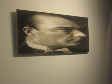 Us—also to be understood, to quote one of the exhibition’s accompanying essays, written by artist Nazım Dikbaş, as “that strange crowd called everyone.” Erdener’s exhibition turned the gallery space into a stage, displaying a frozen scene from the drama of contemporary Turkish society, populated by characters and character-types both fictional and real. A totem pole of fiery red heads of Mustafa Kemal Atatürk, the founder of the modern Turkish Republic, balanced precariously atop a white star, a symbol of the Republican government. Its state of unbalance stood in sharp contrast to a second, steadier pillar positioned a few feet away, comprised of pairs of cartoonish female eyes peering out from beneath a single black veil, topped by a crescent moon, a symbol of the Ottoman tradition. In these twin sculptures, is the star an unstable foundation, the crescent a proudly worn crown? Or is the latter a pair of demonic horns, the former providing a vehicle for multiple perspectives and greater flexibility? Despite their physical proximity, the many gazes of the two totems do not meet, each refusing to acknowledge the existence of the other.