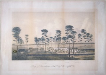 In 2006, Wilson created a print titled 1863 in response to his exhibition, So Much Trouble in the World – Believe it or Not! at the Hood Museum of Art, Dartmouth College (October 5 – December 11, 2005). In direct keeping with his practice of subverting pre-existing images and objects, Wilson altered a hand-colored lithograph depicting a Civil War camp from the museum’s collection titled Camp Massachusetts Sixth Regiment Volunteers, Suffolk, Virginia, dated 1863. When he first viewed the piece, Wilson noticed a minute image of a slave woman hanging laundry in the middle left distance. He then called attention to the figure by overlaying the print with glassine, a semi-transparent paper that is often used to protect prints in storage, and cutting out a small oval that reveals the laboring woman. The “altered” print was displayed in his installation at the Hood and later created as an edition by scanning the original hand-colored lithograph, printing it with archival inks, and overlaying it with a cut piece of glassine. Appropriately, Wilson signed and numbered the glassine, rather than the reproduced military image.