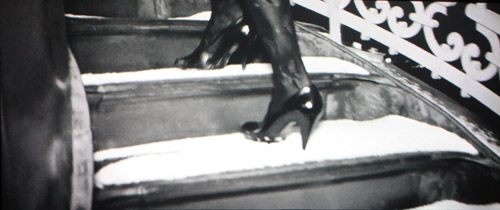 What struck me as a natural ending point for Uncertain Spectator was perhaps the most widely interpretable piece in the whole exhibition, a ten-minute black and white film by Jesper Just entitled A Vicious Undertow. Our vision slowly moves along a rich tapestry that resonates with a feeling of historic weight. We’re so close we can count threads, individual fibers frayed in places, only to find that the patterned and aged fabric is a dress clinging to an aging woman. She sits alone in an opulent parlor and whistles the augmented melody of Nights in White Satin. Her solo becomes a duet when her younger self appears across the parlor – a memory or wishful reflection – and quickly evolves into a trio as a man joins the younger, sultry self. The three intensely alternate in a dance until the older woman, as if queued by sudden percussive tension – final heartbeats? – makes her exit. Despite the downward cast of the title, A Vicious Undertow closes with ascension as the older woman winds her way up a seemingly infinite staircase, an apotheosis after letting go of what she once was.