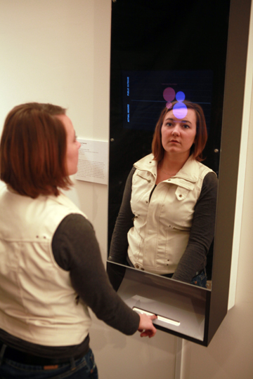 Reality Checking Device by Susanna Hertrich allows us to face ourselves, to literally stare into our own eyes while Yes Men-style information correctives are offered in slick attire. A mirrored image screen activated by a touch-sensitive panel presents vivid circles of color to indicate the disparity between actual hazards and public outrage as inflamed and distorted by media spin. For example, the actual threat of bird flu is miniscule compared to public perception of that threat, just as the chance of crashing in a plane is dwarfed by actual fear surrounding that scenario. (This information didn’t help me much for my return flight to Chicago.) The same is true for terrorist attacks, while the real hazard of cancer and credit card fraud is far greater than our awareness of either. Hertrich asks that we own this information as we read it on our faces in the mirror, an important first step in making informed choices about how we live.