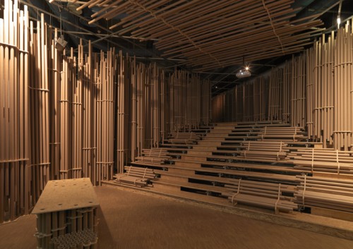 Tobias Putrih isn’t a filmmaker, but several of his site-specific installations have re-imaged cinema interiors through the creation of  life-size environments, where actual films are projected for viewers to sit and watch. One of the things I respond to the most is Putrih’s usage of every day, ephemeral materials such as paper, cardboard, tape, twist ties, and plastic foam to create, among other things, usable structures. Putrih also uses these materials to create maquettes, many of them also cinemas, but the small-scale models often represent structures that would be impossible to construct or use.