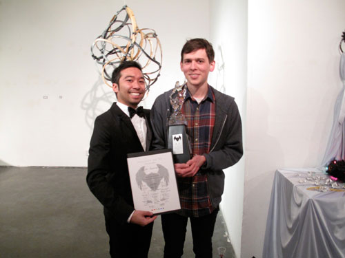 The Prize was a great success for my peers and me. Successful is one of those terrible terms I despise to hear in a critique, as in, “I think this piece is really successful” or “I don’t think this work is as successful as the work you showed us before.” The reason I despise the word in critique is because I don’t know what success means to the artist who said it. However, here in this blog post, successful is defined as sparking conversation between people. The Swell Gallery was filled with contemporary artwork from a diverse group of artists working in different media. If not a crystal ball for the kind of dramatic work to come from artists of my generation, then the show was at least a glimpse into the new wave of personal stories that mimics the everyday of Facebook profiles and i-this and i-that. For me, my artwork rested in The Prize Gala – an evening of wine and catered food from a local Filipino restaurant and, of course, the announcement of The Prize recipient.
