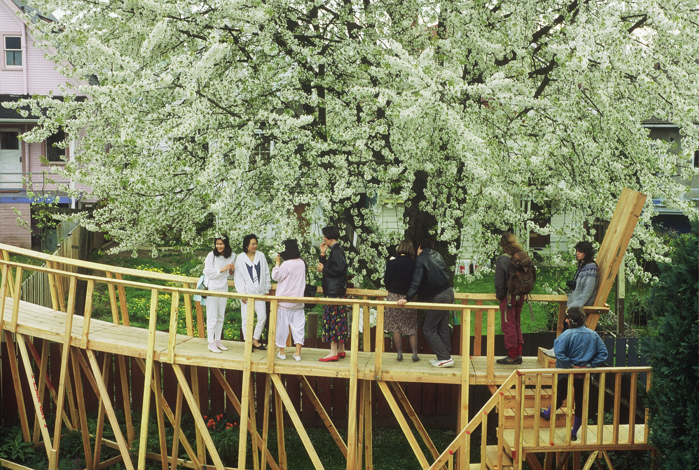 Artist Reece Terris’ scale model of “Bridge” represents the elaborately built 37-foot footpath he created between his home and his neighbor’s. This kind of boardwalk among the trees is more than a mutated idea of the treehouse. A treehouse is a mini version of the home, where kids reenact expectations of private vs. public property lines and negotiate authority over space with peers. When installed, these artists’ site-specific structures, open as they are to the public, temporarily diffuse proprietary practice; after all, they rest metaphorically and literally above the imagined divisions that run through the air between single-family homes.