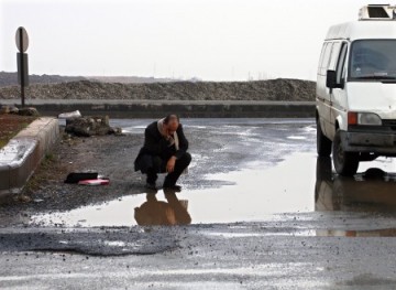 In a conversation with Özmen and critic İz Öztat included in A Sener Özmen Book, gallerist Azra Tüzünoğlu remarks upon two recent shifts in Özmen’s work: the discontinuing of the use of the landscape around Diyarbakır as a primary pictorial technique, and the withdrawal of Özmen himself as a subject of or character in his pieces. Özmen points to the 2009 photograph Kavşak (Crossroads) as a turning point, the moment in which this shift began. In the photograph, Özmen crouches in a parking lot, head in hand, staring fixedly at his reflection in a puddle of rainwater pooled on the pavement. In the background rise mounds of earth, which seem to be part of an unseen construction site. Behind them rise the ghostly outlines of what may be either television and cellular towers or trees—in either case, signs of life and progress, building and growth. To his left lie a sheath of papers, not only put down but literally cast aside so that he might engage in this moment of self-scrutiny. While Tüzünoğlu reads this as a reenactment of the Greek myth of Narcissus, in which a beautiful man becomes so enamored with his own image reflected in a pool of water that he falls into it and drowns, it seems to me as if Özmen may be literally looking for himself, to see how he fits into Diyarbakır’s new landscape. The trauma of war is no longer an external struggle against an armed enemy, whether visible or concealed, but an internal one, in which those left behind must decide how to cope with the events of the past and move into an uncertain future.