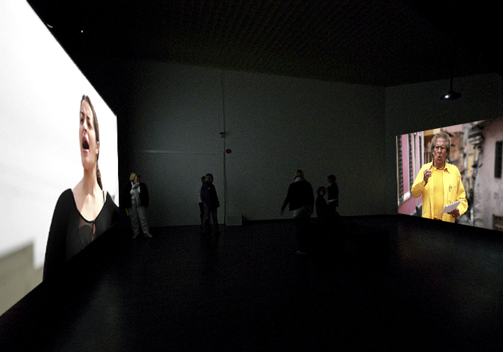 Carlos Motta, "Six Acts: An Experiment in Narrative Justice," 2010. Partial view of the video installation at the Henie Onstad Kunstsenter in Oslo, 2010. Courtesy the artist and Henie Onstad Kunstsenter, Oslo.