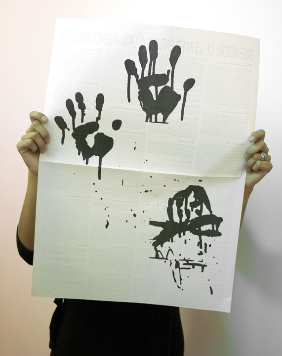 Carlos Motta, "Brief History of U.S Interventions in Latin America Since 1946," 2005. Freely distributed newsprint publication, 22 x 16”. View of a newsprint during exhibition at CCS Bard Hessel Museum of Art, Annandale-on-Hudson, NY, 2008. Courtesy the artist.