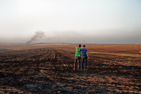 In an untitled 2010 photograph, two casually dressed young men stand in the middle of a scorched, barren field. One (whom I am fairly certain is Tekin himself) points off into the horizon at a plume of black smoke rising from a distant field. Their casual stance implies that they are less concerned with the devastation that surrounds them than they are with the mysterious smoke in the distance. Is it the evidence of a home or field being burnt in the distance? Is it a destructive act, or merely a farmer burning agricultural refuse? Or is it a signal of some kind, an act of communication? As the men casually lean on one another, they don’t seem poised to act, to rush and help or investigate further; theirs is more of a distant interest, like watching a lioness take down and devour a wildebeest on television. This photograph poses new questions to the viewer not only about the experience of individuals living in a formally war-torn region, but about the act of viewing art that is produced in such regions. As viewers, how are we oblivious to the devastation that surrounds us, wherever we may stand? What is our obligation, as we watch from a distance, to move closer and investigate, instead of just observing? These are questions that Tekin leaves us asking, and as usual, remain unanswered, a silence pouring out from two-dimensional photographic space.