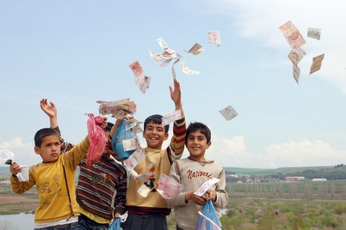 Similarly in the 2009 series of three photographs, Potlatch, a flow of bank notes streams from an unidentified man’s hands into the sky (again, that fiercely blue sky of southern Turkey!), into (or out of?) the gleeful hands of a group of young boys holding bags of toys, and the residential area that hugs the exterior of the ancient city walls of Diyarbakır, where many families, displaced by the fighting in the countryside during the 1980s and 1990s, resettled. In the manner of Tekin’s other works, these photographs present more questions than answers: from whose hands are these funds flowing? To what purposes is it being used? Are the children of Diyarbakir benefiting from this influx of funds in a way that is lasting and meaningful, or is it just providing fleeting distraction? Is it really going to those who are most in need, who suffered the most from the violence, or is it just passing them by?