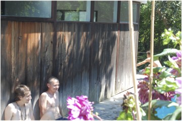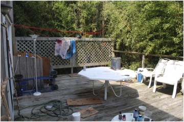 CB: The 2011 FIAR residents were: Elijah Burgher (Chicago), Travis Boyer (Brooklyn), A.K. Burns (Brooklyn), Katie Hubbard (Brooklyn), and Ryan Brewer (Brooklyn). Fire Island has a decades-old legacy as a historically queer site, and a number of artists sought to pull from this legacy to activate and engage their own practices. A.K. Burns and Katie Hubbard interviewed Cherry Grove lesbians for their growing project, “The Brown Bear,” a social archive of feminist histories. Ryan Brewer fasted for a vision quest in the Meat Rack (the Island’s legendary gay male cruising ground and forest separating Cherry Grove from the Pines), where he remained within a drawn, 10-foot circle in the dunes for two days. Elijah Burgher drew text-based sigils, symbols considered to contain magical or spiritual power, and performed a private ritual with AA Bronson. Painter, textile artist, and performance artist Travis Boyer transformed the back deck of the house into an outdoor studio for the creation of cyanotypes, painted fabric, and readymades.