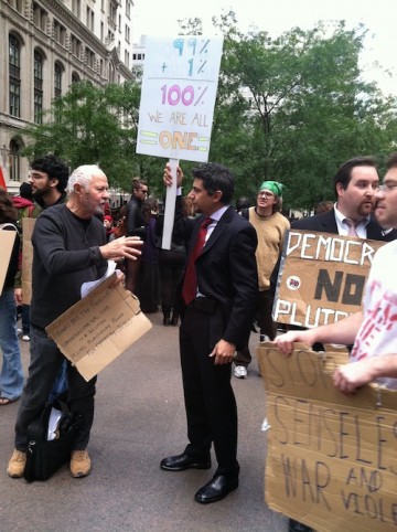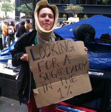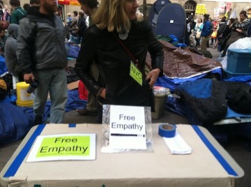 For me, the opportunity for public discussion within the public realm and open to all is one of the unique opportunities created by Occupy Wall Street. All types of people are engaging in debates touching on topics ranging from questioning short sales, to founding a third political party in the US, to asking if given the opportunity would the 99% become the 1%? Amidst this is the People’s Library–donated books for people to become educated on a number of issues–as well as a Food Station, a Media Station, a First Aid Station, a PR Station, a Silk Screening Station, and an Empathy Station. When I asked a woman named Susan who was working at the Empathy booth how she defined empathy, she said empathy starts with sharing a common ground–which reminds me of my favorite poster: 99% + 1% = 100%. If we are all in this together, what should we do together?