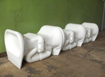 Connor’s recent work departs from projects like Personnel, which attempts to critique labor conditions in post-Fordist work places while also attempting to make those environments more livable for those who must inhabit them. See for instance her project, Fresh Windows, in which the artist points to the dystopian aspects of a windowless office culture, while offering the best possible solution to this problem—barring the creation of windows themselves (curtains and video monitors merely depict life outdoors). One may also check out Connor’s project for an office in Gdansk, Poland, in which she preserves vestiges of the previous post-industrial space by printing a photograph of the space on curtains. In her renovation she uses casts of toilets for seating, which she says she hopes will maintain a sense of humor in the work environment.