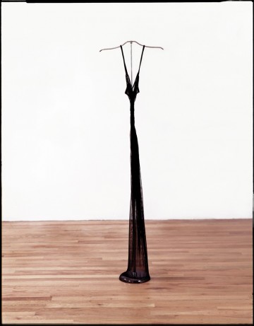 "Thinner Than You," 1990. Stretch net over stainless steel dress rack, 60” X 16” x 8." Photo: Thaddeus Govan.
