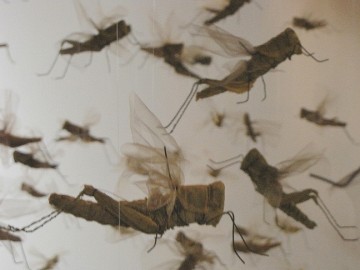 A cinematic precedent, unknown to Tilton when he began the project, is the 1967 film, Five Million Years to Earth, or (to cite its original British title) Quatermass and the Pit, in which scientists investigating an ancient spacecraft excavated beneath a London street discover a disquieting fact: that, long ago, primitive humans were implanted with the memories of long-extinct Martian scientists—our grasshopper-like creators—and that we, their descendants, are susceptible to reliving, maddened by hallucinations, those primordial alien “cleansings of the hive,” and attacking “different” others, telekinetically. Tilton’s three-part show comprises a sculpture, The Lovers, a pair of larger-than-human mating locusts fashioned from steel tubing and damar/beeswax-impregnated muslin; Individuals, an installation of nearly five hundred handmade locust puppets suspended on fishing line and animated into swarming flight by a motor-driven camshaft; and nine Potential wall reliefs, trompe-l’oeil masterpieces representing sections of earth (dirt, clay, pebbles) pierced by locust ovipositor tunnels and their glistening bundles of eggs—both beautiful and scary, like human overpopulation and mutation.