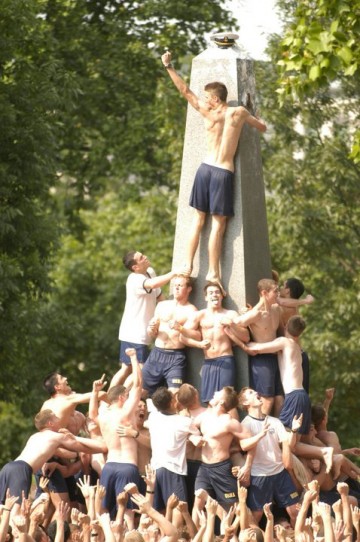 After my job hunt, it’s studio time. It’s basically time for another meal, so I make some ramen noodles and go back to surfing the Web. As of late, I’ve been fixated on Peace Poles—tall skinny wooden posts with the inscription “May Peace Prevail on Earth” planted outside churches, homes, or sites of recent conflict—so I do some research on the objects. For me, everything religious has a gay twist to it, so the aesthetic of the pointy wooden post nudges me to research The Herndon Climb. At the US Naval Academy in Annapolis there stands a 21-foot grey obelisk called the Herndon Monument which is the site of year-end event known as The Herndon Climb. One thousand young academy plebes attempt to climb the lard-covered monument to replace a plebe hat sitting atop it with an upperclassman’s hat. By the end of the two-hour-ish event, the scene formally looks like last call at a gay dance club—shirtless teens soaked in water and covered in grease, tired from all the shouting, grunting, and physical activity.