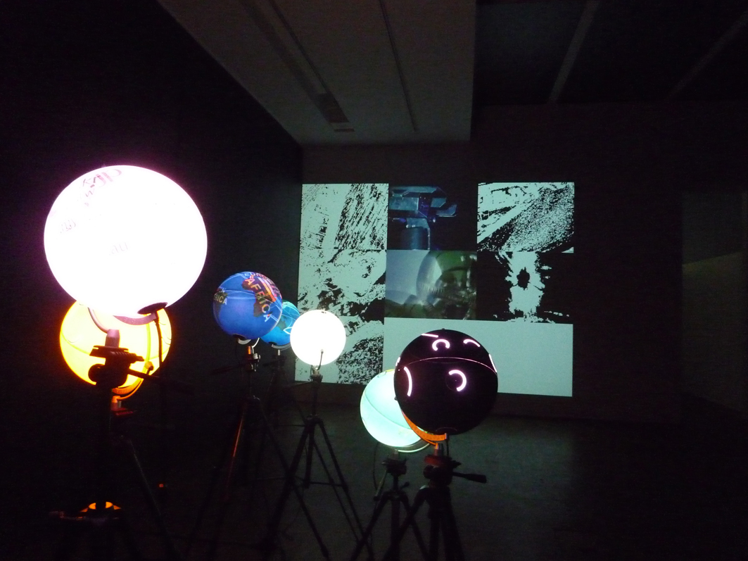 The main components of the installation are always included in each presentation of the work–the fluid and shifting, ephemeral ecology of the 99 large red latex weather balloons, which are attached to the ground by several tethers and networked with nine video cameras, each attached underneath a balloon. With the help of a computer, they broadcast real-time streaming video displayed as nine single-channel video projections.