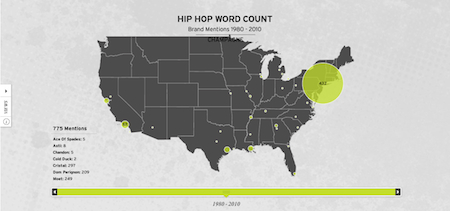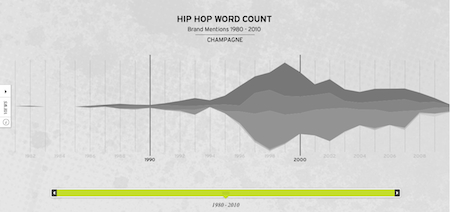 Reactions to Hemphill’s project are “always mixed,” he says. “Some people call me a genius and some people call me an idiot.” I for one am glad he’s not letting this discourage him. “There’s so much more to be rolled out.” Hemphill is preparing for the public launch of Hip-Hop Word Count (meaning you’ll be able to do your own keyword searches), a more in-depth presentation of his champagne findings is in the works, and his Research Rap Group, a gathering of “serious academics,” is studying the geographic spread of slang terms, recidivism and rap, and references to women in hip-hop. Champagne was a fine place to start but I bet we are going to learn much more about consumption as this research continues.