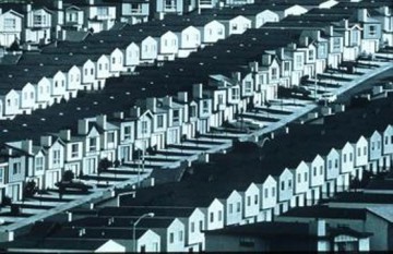 Many artists have portrayed the trademark sameness of the man-made suburban environment. While their images often suggest generic scenes, their very act of depiction—the artists’ decision to focus on that particular town or house, car or lot—individualizes the subject matter. Images like Robert Adams’s Colorado Springs, Colorado (1968–70) capture the landscape’s clean lines and serial nature. But the lone woman standing inside reminds us that even in the most sterile and controlled environments, individuals persist. She remains unknown to us, and this distance amplifies the possibilities of her experience: Is she crying inside? Lonely or sad? Is she simply wondering what to clean next? Does she know she’s being watched?