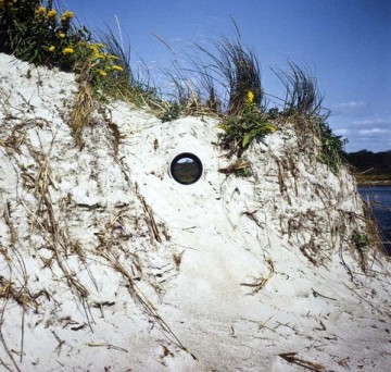 Nancy Holt. "Views Through a Sand Dune," 1972. Cement-asbestos pipe, sand, Narragansett Beach, Rhode Island. © Nancy Holt/Licensed by VAGA, New York.