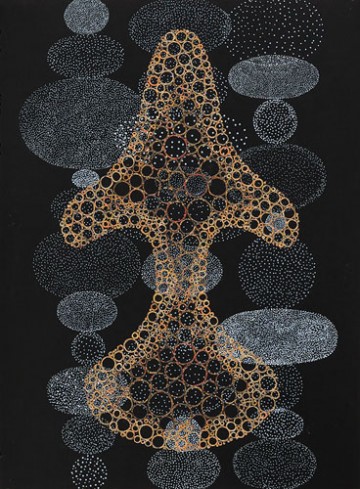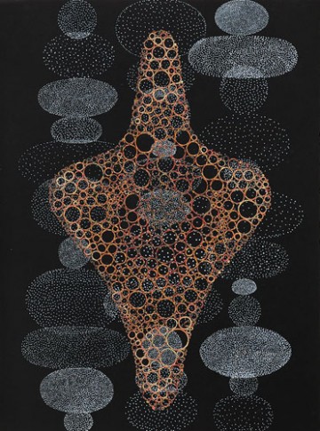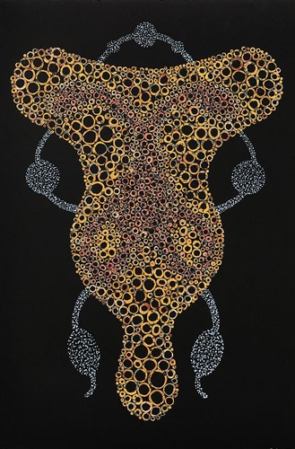David King is a collage artist based in San Francisco. In the last several years, his work has moved away from representational imagery into abstraction. The sensual and magic-realist inflection of the earlier work is still a resonant factor in his latest series called “Talismans.” It is as if the impressions elicited by King’s older dreamscapes (populated by classical figures, athletes, yogis and jeweled architectures) had been collected, purified and condensed. Suddenly, the human body is gone altogether and the props of opera and fairytale dissolved. All that remains is the darkened stage on which the exquisite remnants of his older work have coalesced into archaic amulets. The picture plane becomes a theater of talismans more potent than one with human actors. And yet there is something incredibly alive about these “things” which exude an almost watchful persona while they hover against panoplies of starry clusters.