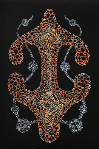 In later Minoan and Mycenean cultures this feminine presence is aligned with serpent and bull: those animals of the arcing body parts, the crescent horn and the spiral coil. These nonhuman physiognomies become paralleled in the sinuous movements held by the human figures of old Crete. In the way of a family-resemblance, King’s Talismans hold the viewer through their connection to such ritual maneuvers: the raised “arms,” the flaring out of the “cape/skirt,” the serpentine rising of the “magic wands” behind the figure. These forms all appear to be in the act of filling up, of climbing vertically, of readying as a magician readies through a regime of minor movements before culminating in a final grand gesture which will bring about some impressive metamorphosis.