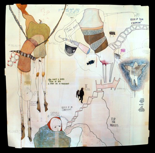 JS: In many ways I’m mapping the ways things come together in my mind. Because my process is so automatic and intuitive, the best comparison that I can make is to being plopped in the middle of some dense wilderness. What unfolds on the canvas is an account of what I bump up against along the way, mixed with reverie for what it might mean and how it feels. I map the terrain as it’s being re-discovered and documented, before I get to the point where I’m able to stand on the mountaintop and properly survey the landscape below.