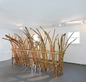 Cut sugar cane was the centerpiece of Michael Pribich’s spring installation for Project Row Houses, where food was the focus of their spring exhibition. Pribich, unlike other artists highlighted in this post, calls attention to sugar’s darker side. Bags of Imperial Sugar stacked upon wall-mounted machetes made reference to current labor practices in the Caribbean, where Pribich first witnessed cane harvesting. In the Dominican Republic, “Haitian field workers were hand-harvesting ‘cana’ with machetes,” he writes. “Oxen teams pulled wooden carts laden with cut sugar cane. The fields stretched for miles and miles with laborers scattered along the horizon. A pastoral, Bruegel scene it was not … sugar is not so simple.”