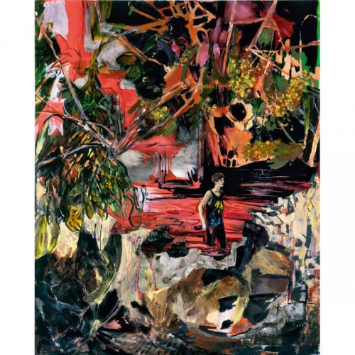 HB: I do like the idea that everything is contained—the entire narrative, within the frame of the canvas; but paintings that I consider to be successful are always on the verge of falling apart. To me, that’s the fun of it—the eminent collapse, and also the challenge. The formal clichés about composition do play into it, but then when I look at paintings that are the least successful in the formal sense, they are most successful from my perspective as the painter. The scale, proportions, and things like that don’t figure in too realistically into my work. Sometimes the work can be described as flat, but I don’t particularly mind that, because to me it is a collage of elements. In terms of this painting [The Jack of the Lantern], the scale is relatively intact in relation to the figures, but then you have these giant vines which can either be seen as adding to or enveloping the painting—almost like they’re attacking in defiance of being a proper painting. I think the best paintings that I’ve done are overgrowth, and you have to sort of chop through to get to what’s going on.